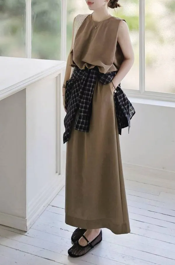 中等厚度布料,柔軟帶一點挺度,腰部有鬆緊,兩側口袋,後開衩,有內裡