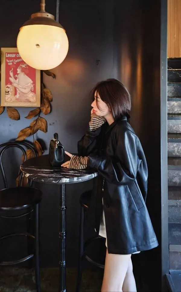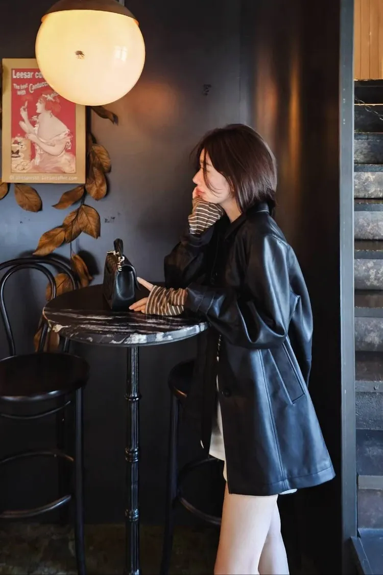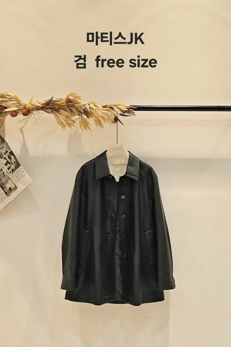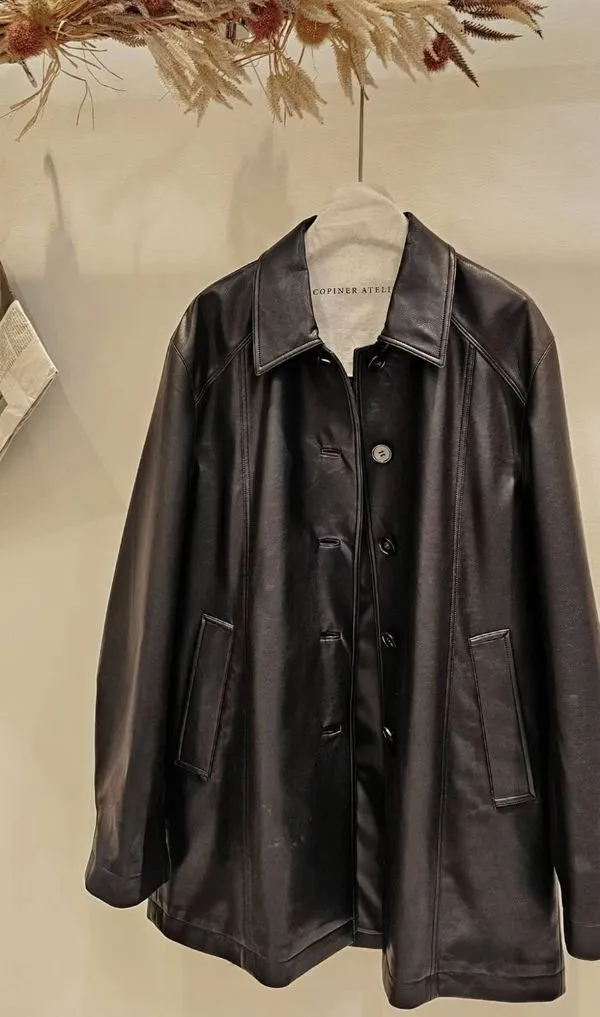 時髦經典的仿皮革夾克,基礎經典領型設計+中長衣長,搭配褲裝或是裙裝都好看😎🖤