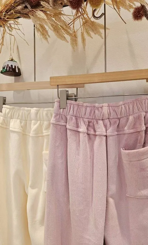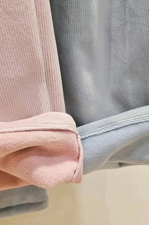 布料柔軟有挺度,外層是細緻燈芯絨,內層是舒適短絨毛,觸感極柔極軟,腰部寬鬆緊帶適中不勒,當居家服都沒問題的舒適感