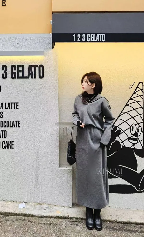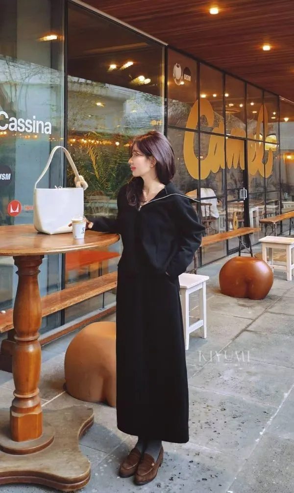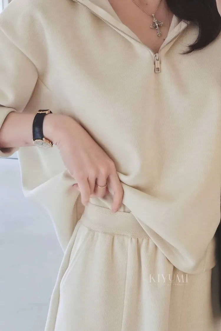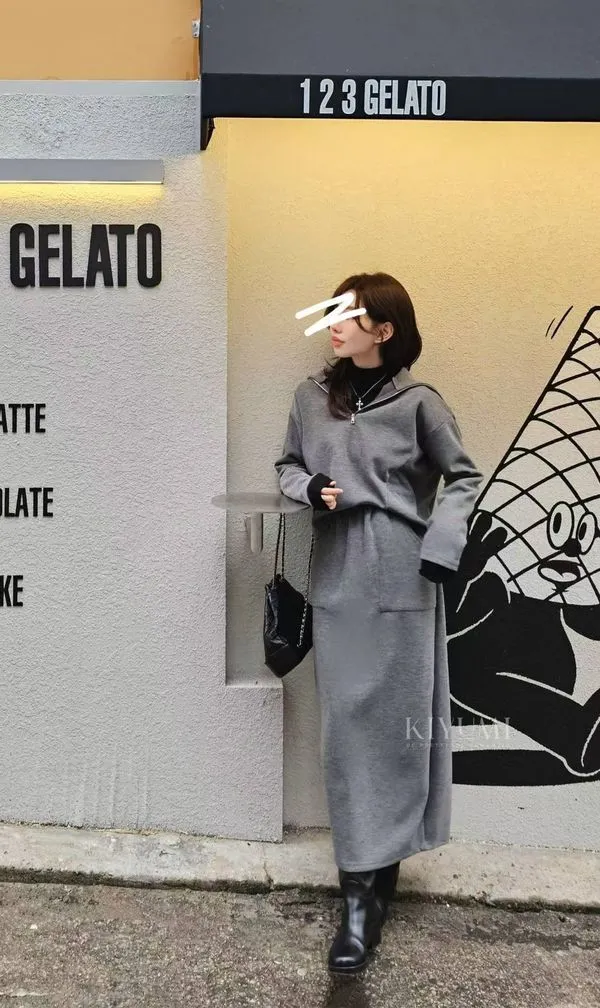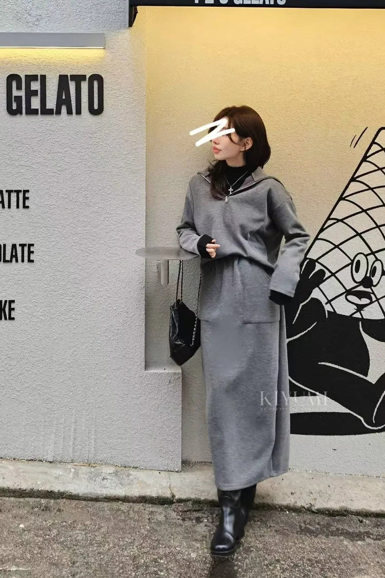 高質感細緻羅馬布面料,5%羊毛混仿,完全親膚柔軟不會刺癢,中等厚度布料~。上衣拉鍊設計可以穿成高領或是大翻領,前後的兩側都有做腰線剪裁,裙子也是Hline,修身顯瘦設計